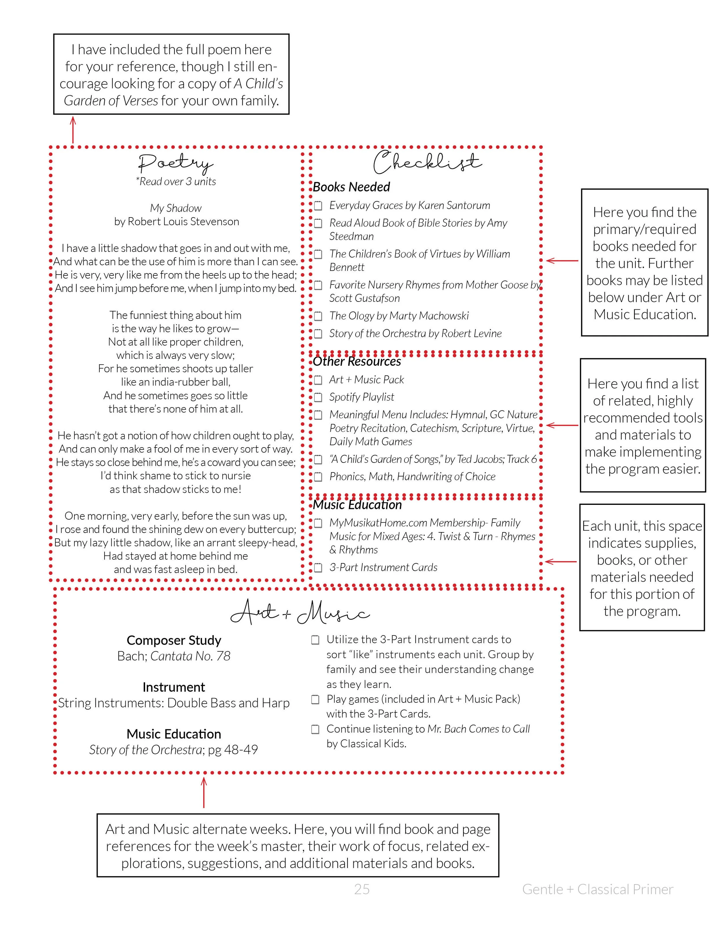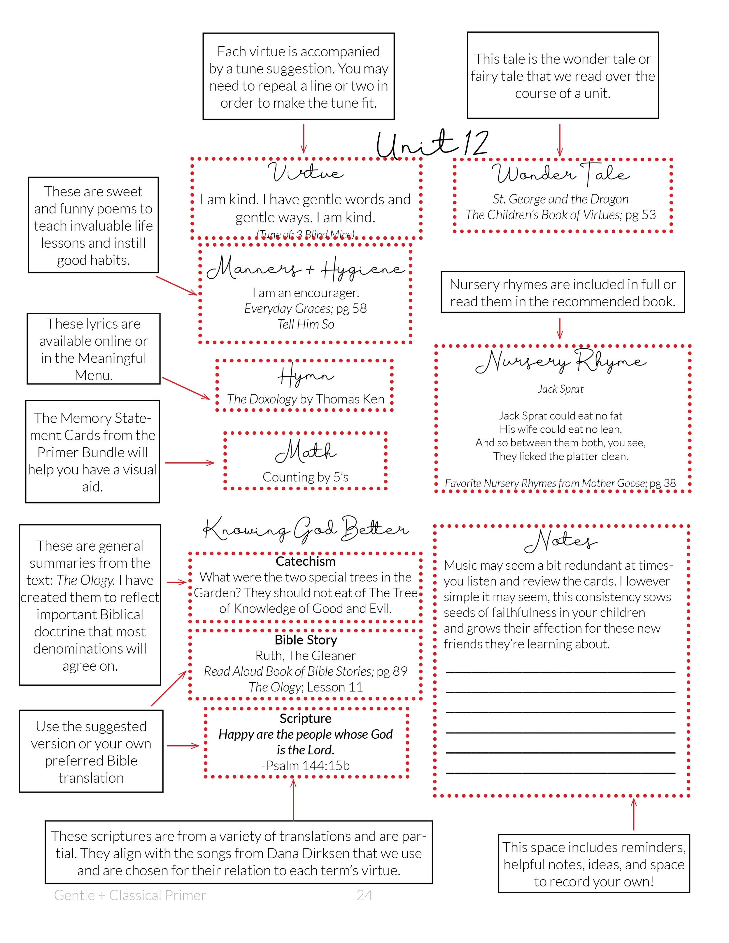 You will receive 36 units of content, including detailed teacher's notes and tips, organizational tips, and encouragement about education in the early years. The memory work includes: