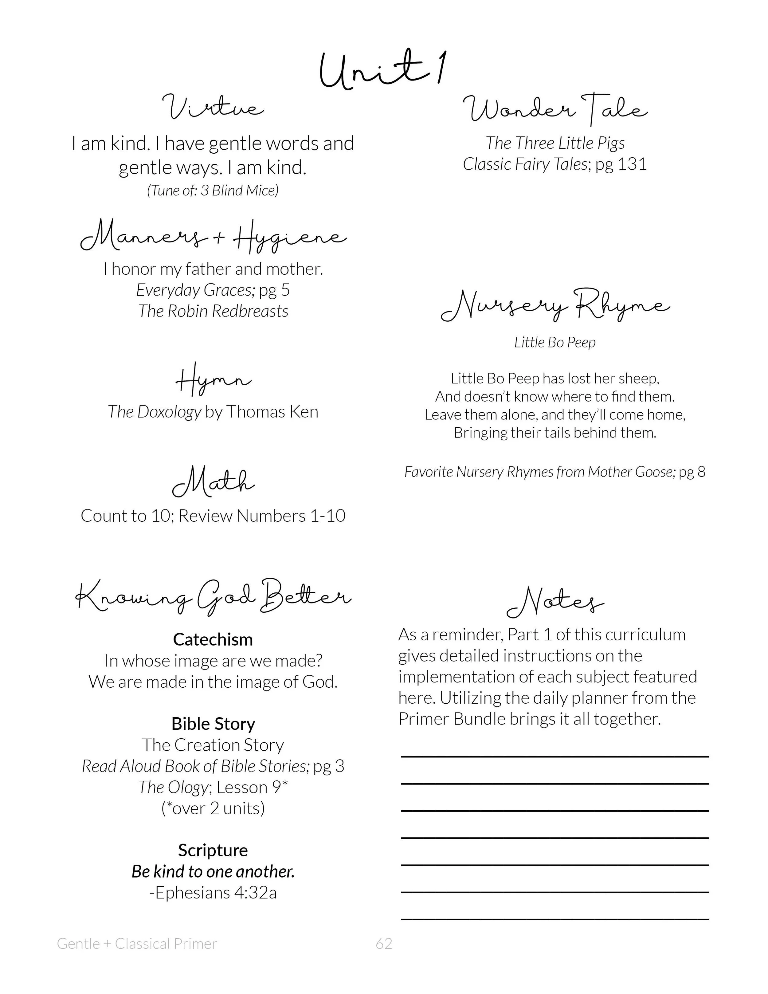 This program is completely sufficient (and then some) for a typical 5-7-year-old child. For your kindergarten and first-grade child, you should add an additional program like All About Reading for a systematic introduction in phonics and a math program like Kindergarten Math with Confidence. Primer was designed to work in a very complimentary way with Gentle + Classical Nature as the science and nature exploration portion of the program. While they can be used completely separately, they work very well together and create a rich experience! Additionally, I have created a Bundle of printable materials to make implementation all the easier for you.