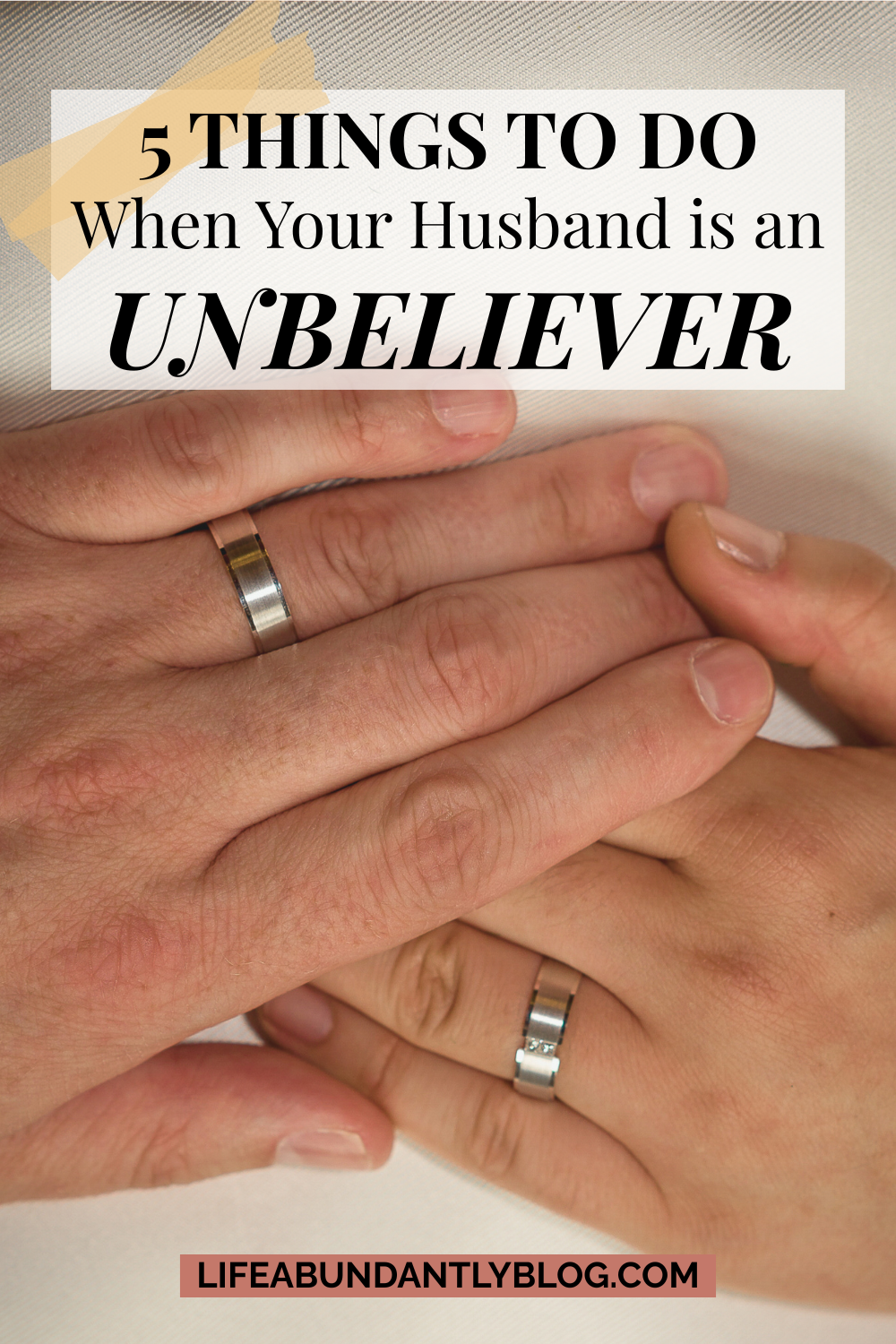 4. Pray, pray, pray. When you think you’re done, pray some more. Have every believing friend praying. Don’t be ashamed to admit you have an unbelieving spouse! We are all unbelievers at one point. Make sure your husband is being showered and saturated in prayer, by everyone who is willing.